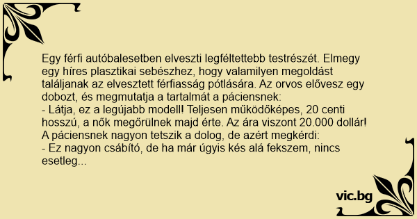 - Nem! - feleli az orvos, és elővesz egy újabb dobozt. - Itt van a csúcsmodell. 35 centiméter, tiszta izom, a nők álma! Örök garanciával, mindössze 50.000 dollár az ára, a munkadíjjal együtt!