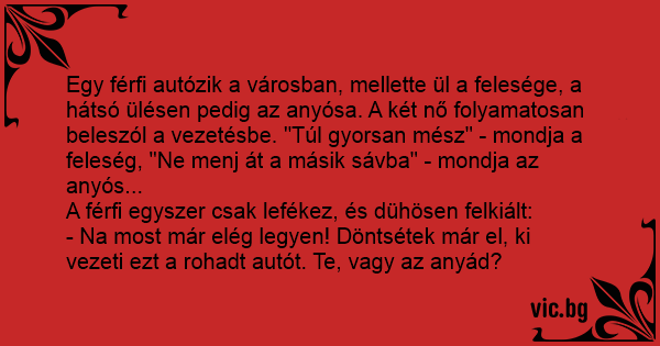 Egy férfi autózik a városban, mellette ül a felesége, a hátsó ülésen pedig az anyósa. A két nő folyamatosan beleszól a vezetésbe. "Túl gyorsan mész" - mondja a feleség, "Ne menj át a másik sávba" - mondja az anyós...