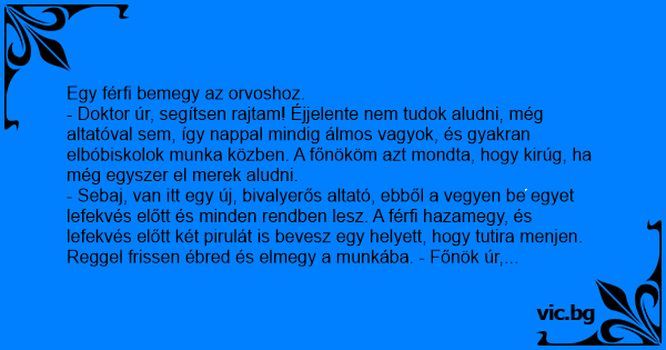 - Sebaj, van itt egy új, bivalyerős altató, ebből a vegyen be egyet lefekvés előtt és minden rendben lesz. A férfi hazamegy, és lefekvés előtt két pirulát is bevesz egy helyett, hogy tutira menjen. Reggel frissen ébred és elmegy a munkába. - Főnök úr, soha többé nem fogok elaludni munka közben!