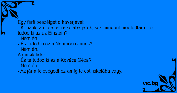 Két munkás beszélget az ebédszünetben. - Te haver, képzeld beiratkoztam a dolgozók esti iskolájába és egy csomó érdekességet tanultam már. Tudod te például, hogy ki az az Albert Einstein? - Honnan...