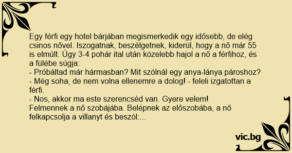 Egy férfi egy hotel bárjában megismerkedik egy idősebb, de elég csinos nővel. Iszogatnak, beszélgetnek, kiderül, hogy a nő már 55 is elmúlt. Úgy 3-4 pohár ital után közelebb hajol a nő a férfihoz, és a fülébe súgja: