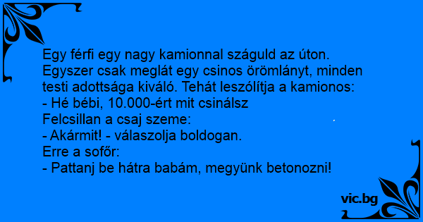 Egy férfi egy nagy kamionnal száguld az úton. Egyszer csak meglát egy csinos örömlányt, minden testi adottsága kiváló. Tehát leszólítja a kamionos: