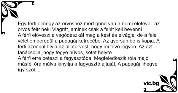 A férfi erre beteszi a fagyasztóba. Megfeledkezik róla majd másfél óra múlva kinyitja a fagyasztó ajtaját, A papagáj lihegve így szól: