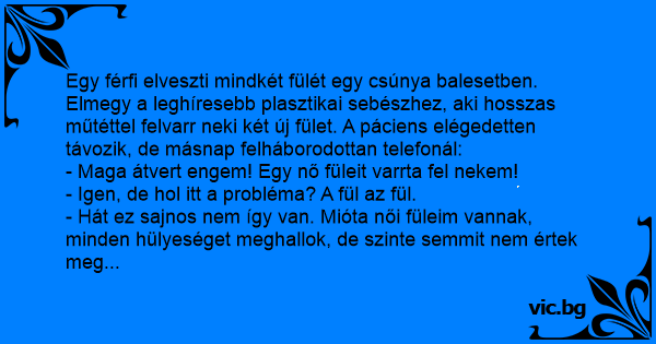 Egy férfi elveszti mindkét fülét egy csúnya balesetben. Elmegy a leghíresebb plasztikai sebészhez, aki hosszas műtéttel felvarr neki két új fület. A páciens elégedetten távozik, de másnap felháborodottan telefonál: