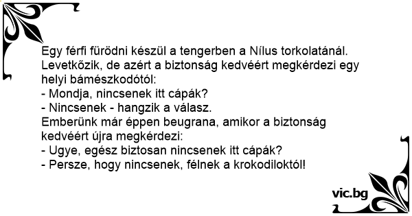 Egy férfi fürödni készül a tengerben a Nílus torkolatánál. Levetkőzik, de azért a biztonság kedvéért megkérdezi egy helyi bámészkodótól: