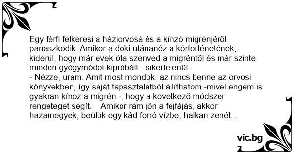 - Nézze, uram. Amit most mondok, az nincs benne az orvosi könyvekben, így saját tapasztalatból állíthatom -mivel engem is gyakran kínoz a migrén -, hogy a következő módszer rengeteget segít. Amikor rám jön a fejfájás, akkor hazamegyek, beülök egy kád forró vízbe, halkan zenét hallgatok és közben a feleségem masszírozza a halántékomat, majd később az egész testemet. Ezután, akármennyire is fáj a fejem, szeretkezek egy jót a gyönyörűszép nejemmel. Higgye el, utána sookal jobb lesz. Bróbálja csak ki és 6 hét múlva jöjjön vissza, kíváncsi vagyok az eredményre.