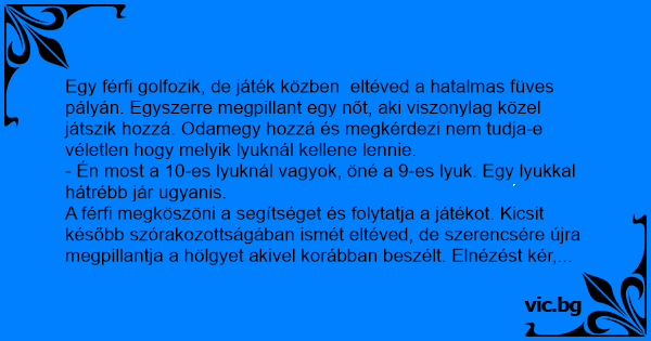 Egy férfi golfozik, de játék közben eltéved a hatalmas füves pályán. Egyszerre megpillant egy nőt, aki viszonylag közel játszik hozzá. Odamegy hozzá és megkérdezi nem tudja-e véletlen hogy melyik lyuknál kellene lennie.