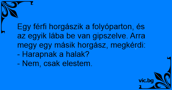Egy férfi horgászik a folyóparton, és az egyik lába be van gipszelve. Arra megy egy másik horgász, megkérdi:
