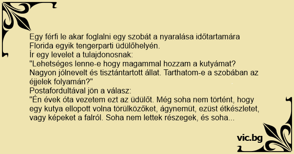 "Én évek óta vezetem ezt az üdülőt. Még soha nem történt, hogy egy kutya ellopott volna törülközőket, ágynemüt, ezüst étkészletet, vagy képeket a falról. Soha nem lettek részegek, és soha nem mentek el úgy hogy nem fizették volna a számlát. Szóval, a kutyája nagyon is szivesen van látva.