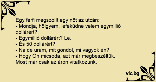 Csinos nőt leszólít egy férfi: - Hölgyem, lefeküdne velem egymillió forintért? A nő rácsodálkozik, majd csillogó szemmel így szól: "Le." - És lefeküdne velem 2000 forintért? - Mit képzel, ki vagyok...
