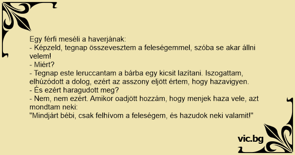 - Képzeld, tegnap összevesztem a feleségemmel, szóba se akar állni velem!