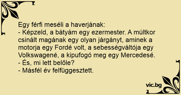 - Képzeld, a bátyám egy ezermester. A múltkor csinált magának egy olyan járgányt, aminek a motorja egy Fordé volt, a sebességváltója egy Volkswagené, a kipufogó meg egy Mercedesé.