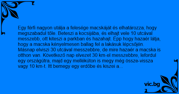 Egy férfi nagyon utálja a felesége macskáját és elhatározza, hogy megszabadul tőle. Beteszi a kocsijába, és elhajt vele 10 utcával messzebb, ott kiteszi a parkban és hazahajt. Épp hogy hazaér látja, hogy a macska kényelmesen ballag fel a lakásuk lépcsőjén.