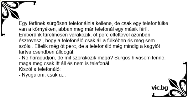 Egy férfinek sürgősen telefonálnia kellene, de csak egy telefonfülke van a környéken, abban meg már telefonál egy másik férfi. Emberünk türelmesen várakozik, öt perc elteltével azonban észreveszi, hogy a telefonáló csak áll a fülkében és meg sem szólal. Eltelik még öt perc, de a telefonáló még mindig a kagylót tartva csendben álldogál: