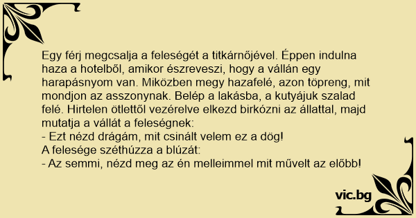 Egy férj megcsalja a feleségét a titkárnőjével. Éppen indulna haza a hotelből, amikor észreveszi, hogy a vállán egy harapásnyom van. Miközben megy hazafelé, azon töpreng, mit mondjon az asszonynak. Belép a lakásba, a kutyájuk szalad felé. Hirtelen ötlettől vezérelve elkezd birkózni az állattal, majd mutatja a vállát a feleségnek: