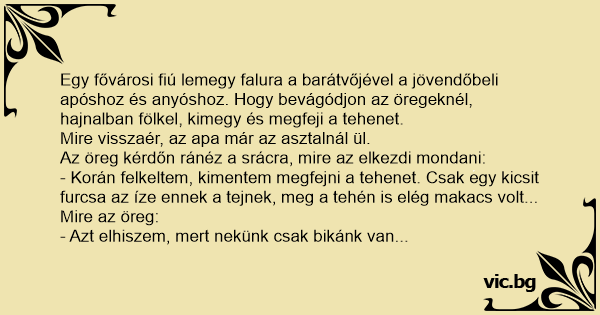 - Korán felkeltem, kimentem megfejni a tehenet. Csak egy kicsit furcsa az íze ennek a tejnek, meg a tehén is elég makacs volt...