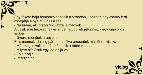 Egy fekete hajú bombázó napozik a strandon, körülötte egy csomó férfi csorgatja a nyálát. Felül a csaj: