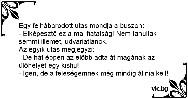 - Elképesztő ez a mai fiatalság! Nem tanultak semmi illemet, udvariatlanok.