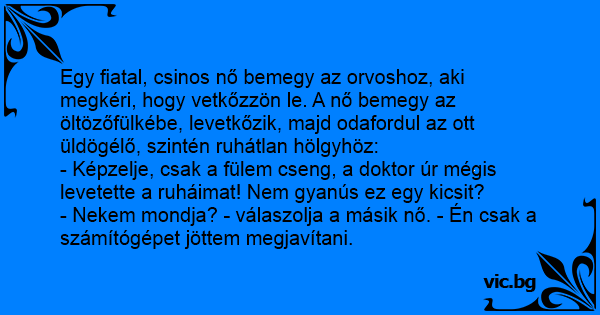 - Képzelje, csak a fülem cseng, a doktor úr mégis levetette a ruháimat! Nem gyanús ez egy kicsit?