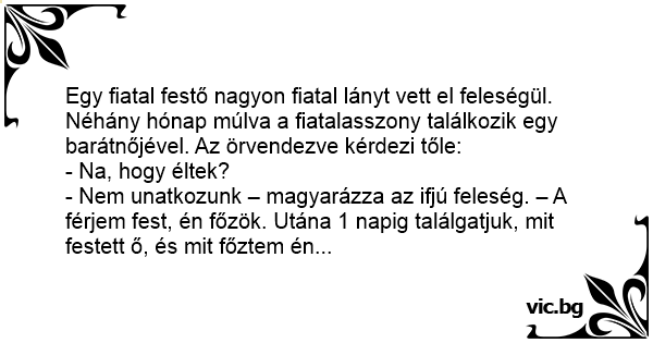 - Nem unatkozunk – magyarázza az ifjú feleség. – A férjem fest, én főzök. Utána 1 napig találgatjuk, mit festett ő, és mit főztem én...