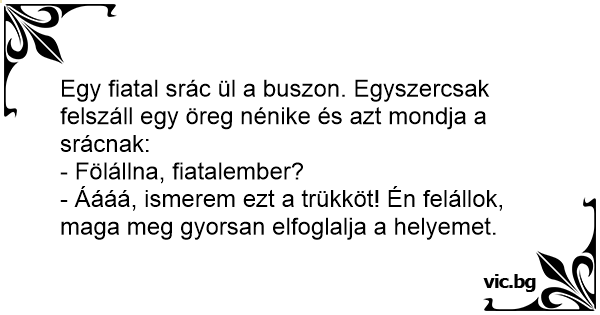 Egy fiatal srác ül a buszon. Egyszercsak felszáll egy öreg nénike és azt mondja a srácnak: