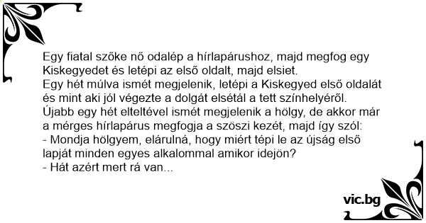 Újabb egy hét elteltével ismét megjelenik a hölgy, de akkor már a mérges hírlapárus megfogja a szöszi kezét, majd így szól: