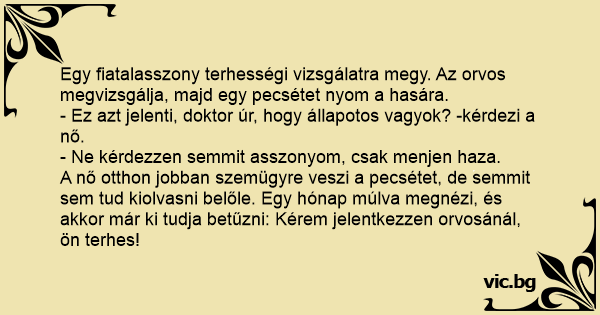 A nő otthon jobban szemügyre veszi a pecsétet, de semmit sem tud kiolvasni belőle. Egy hónap múlva megnézi, és akkor már ki tudja betűzni: Kérem jelentkezzen orvosánál, ön terhes!