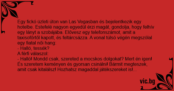 - Halló! Mondd csak, szereted a mocskos dolgokat? Mert én igen! És szeretem keményen és gyorsan csinálni! Bármit megteszek, amit csak kitalálsz! Hozhatsz magaddal játékszereket is! Megkötözhetsz, leszíjazhatsz, és abba sem hagyjuk egész éjjel! Na, ehhez mit szólsz?
