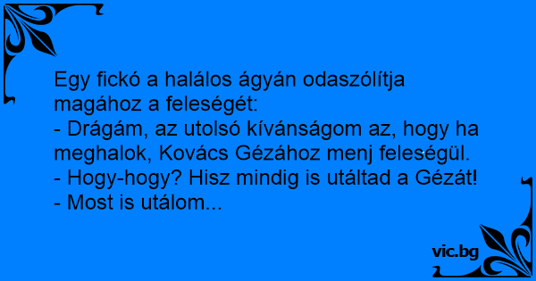 - Drágám, az utolsó kívánságom az, hogy ha meghalok, Kovács Gézához menj feleségül.