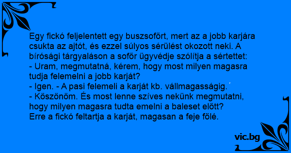 Egy fickó feljelentett egy buszsofőrt, mert az a jobb karjára csukta az ajtót, és ezzel súlyos sérülést okozott neki. A bírósági tárgyaláson a sofőr ügyvédje szólítja a sértettet: