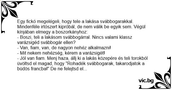 - Jól van fiam. Menj haza, állj ki a lakás közepére és teli torokból üvöltsd el magad, hogy "Rohadék svábbogarak, takarodjatok a büdös francba!" De ne felejtsd el fiam, nagyon fontos, hogy a varázsige alkalmazása közben nem szabad nevetni!