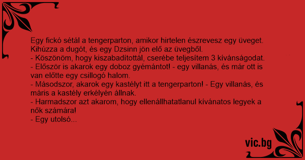 - Köszönöm, hogy kiszabadítottál, cserébe teljesítem 3 kívánságodat.