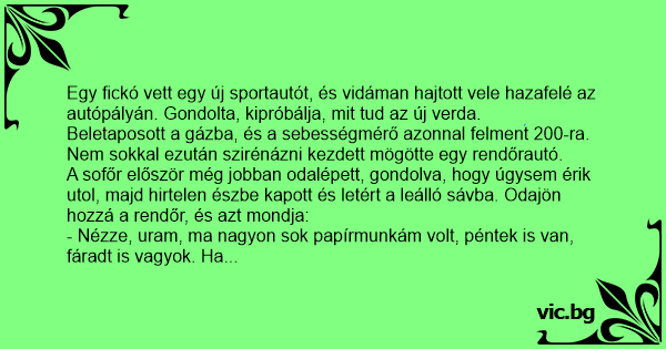 A sofőr először még jobban odalépett, gondolva, hogy úgysem érik utol, majd hirtelen észbe kapott és letért a leálló sávba. Odajön hozzá a rendőr, és azt mondja: