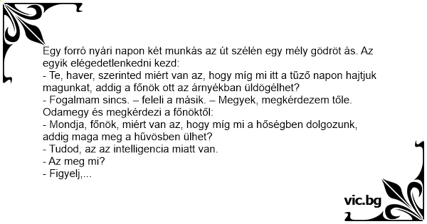- Te, haver, szerinted miért van az, hogy míg mi itt a tűző napon hajtjuk magunkat, addig a főnök ott az árnyékban üldögélhet?