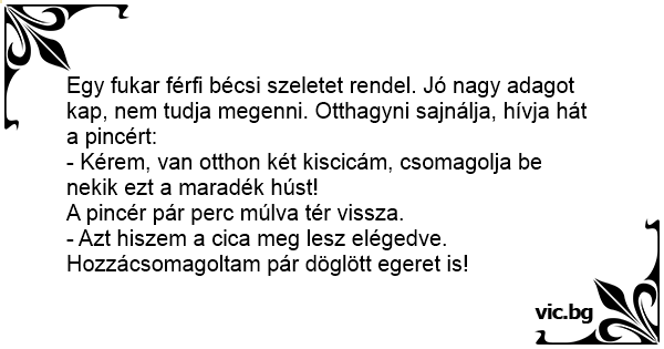Egy fukar férfi bécsi szeletet rendel. Jó nagy adagot kap, nem tudja megenni. Otthagyni sajnálja, hívja hát a pincért: