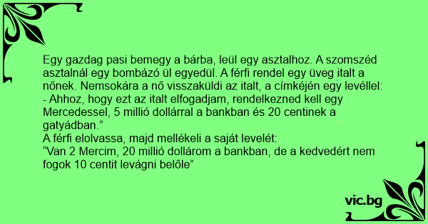 Egy gazdag pasi bemegy a bárba, leül egy asztalhoz. A szomszéd asztalnál egy bombázó ül egyedül. A férfi rendel egy üveg italt a nőnek. Nemsokára a nő visszaküldi az italt, a címkéjén egy levéllel: