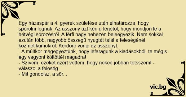 Egy házaspár a 4. gyerek születése után elhatározza, hogy spórolni fognak. Az asszony azt kéri a férjétől, hogy mondjon le a hétvégi sörözésről. A férfi nagy nehezen beleegyezik. Nem sokkal ezután több, nagyobb összegű nyugtát talál a feleségénél kozmetikumokról. Kérdőre vonja az asszonyt: