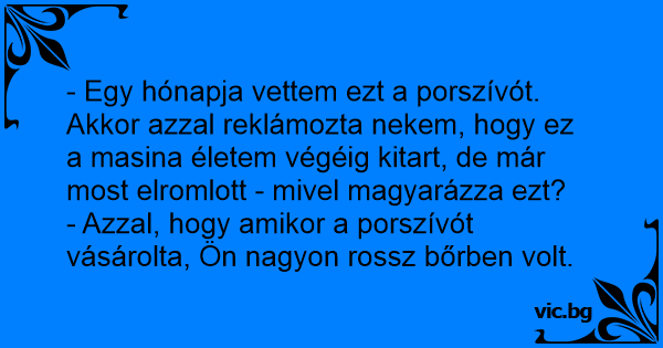 - Egy hónapja vettem ezt a porszívót. Akkor azzal reklámozta nekem, hogy ez a masina életem végéig kitart, de már most elromlott - mivel magyarázza ezt?