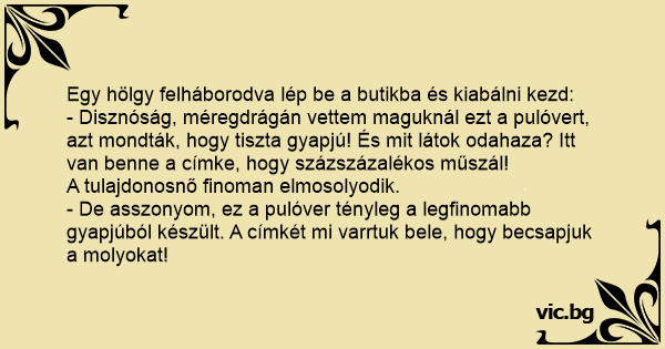 - De asszonyom, ez a pulóver tényleg a legfinomabb gyapjúból készült. A címkét mi varrtuk bele, hogy becsapjuk a molyokat!