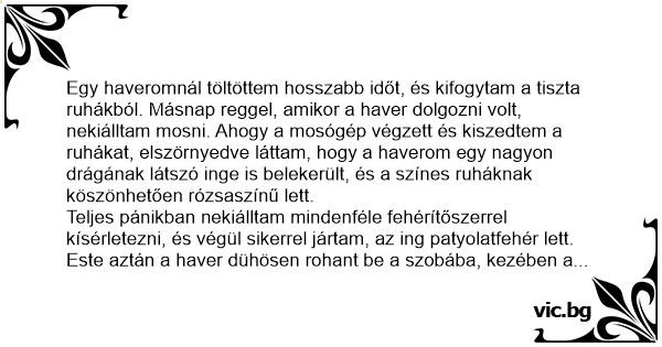 Egy haveromnál töltöttem hosszabb időt, és kifogytam a tiszta ruhákból. Másnap reggel, amikor a haver dolgozni volt, nekiálltam mosni. Ahogy a mosógép végzett és kiszedtem a ruhákat, elszörnyedve láttam, hogy a haverom egy nagyon drágának látszó inge is belekerült, és a színes ruháknak köszönhetően rózsaszínű lett.