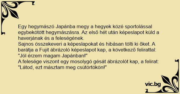 Egy hegymászó Japánba megy a hegyek közé sportolással egybekötött hegymászásra. Az első hét után képeslapot küld a haverjának és a feleségének.