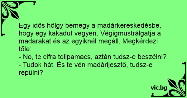 Egy idős hölgy bemegy a madárkereskedésbe, hogy egy kakadut vegyen. Végigmustrálgatja a madarakat és az egyiknél megáll. Megkérdezi tőle: