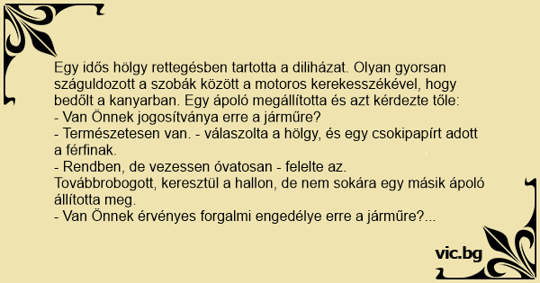 Egy idős hölgy rettegésben tartotta a diliházat. Olyan gyorsan száguldozott a szobák között a motoros kerekesszékével, hogy bedőlt a kanyarban. Egy ápoló megállította és azt kérdezte tőle: