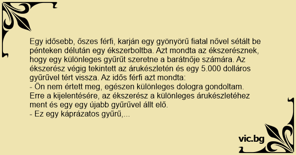 Egy idősebb, őszes férfi, karján egy gyönyörű fiatal nővel sétált be pénteken délután egy ékszerboltba. Azt mondta az ékszerésznek, hogy egy különleges gyűrűt szeretne a barátnője számára. Az ékszerész végig tekintett az árukészletén és egy 5.000 dolláros gyűrűvel tért vissza. Az idős férfi azt mondta: