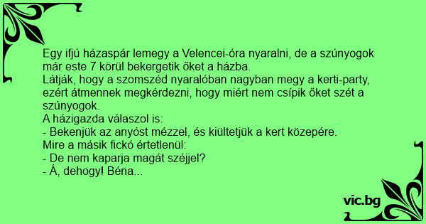 Látják, hogy a szomszéd nyaralóban nagyban megy a kerti-party, ezért átmennek megkérdezni, hogy miért nem csípik őket szét a szúnyogok.