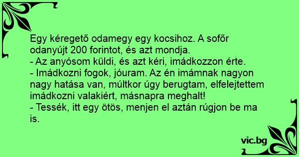 - Imádkozni fogok, jóuram. Az én imámnak nagyon nagy hatása van, múltkor úgy berugtam, elfelejtettem imádkozni valakiért, másnapra meghalt!