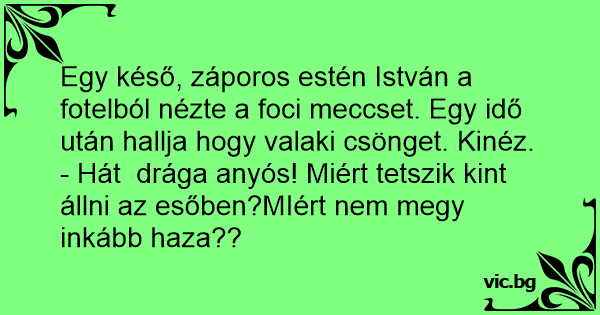 Egy késő, záporos estén István a fotelból nézte a foci meccset. Egy idő után hallja hogy valaki csönget. Kinéz.
