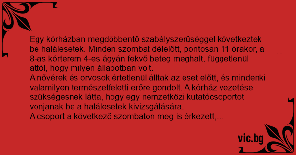Egy kórházban megdöbbentő szabályszerűséggel következtek be halálesetek. Minden szombat délelőtt, pontosan 11 órakor, a 8-as kórterem 4-es ágyán fekvő beteg meghalt, függetlenül attól, hogy milyen állapotban volt.