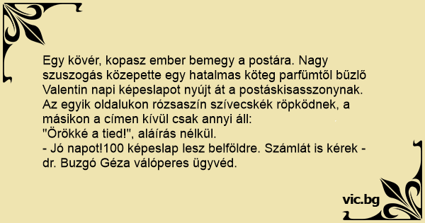 Egy kövér, kopasz ember bemegy a postára. Nagy szuszogás közepette egy hatalmas köteg parfümtől bűzlő Valentin napi képeslapot nyújt át a postáskisasszonynak.