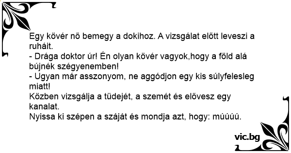 Egy kövér nő bemegy a dokihoz. A vizsgálat előtt leveszi a ruháit.